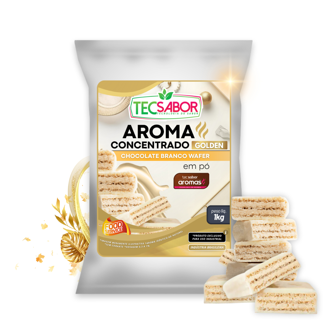 Aroma Idêntico ao Natural de Golden Chocolate Branco e Wafer (AIN) apresenta um perfil aromático doce, cremoso e sofisticado, com notas marcantes de chocolate branco, nuances lácteas aveludadas e toques levemente tostados de wafer, finalizado por um fundo dourado suavemente alcoólico que remete a sobremesas premium, ideal para aplicações que buscam indulgência e elegância sensorial.