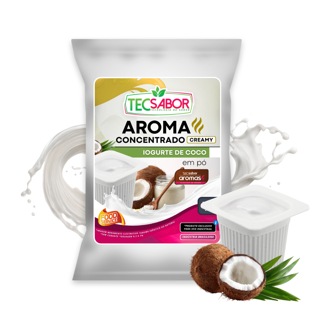 Aroma Idêntico ao Natural de Iogurte de Coco (AIN): desenvolvido em pó com perfil creamy e lácteo equilibrado, combinando a acidez suave do iogurte com notas adocicadas e tropicais do coco, proporcionando cremosidade sensorial, excelente estabilidade térmica e ótima performance em aplicações industriais como sorvetes, gelados, sobremesas, bebidas e produtos lácteos processados.