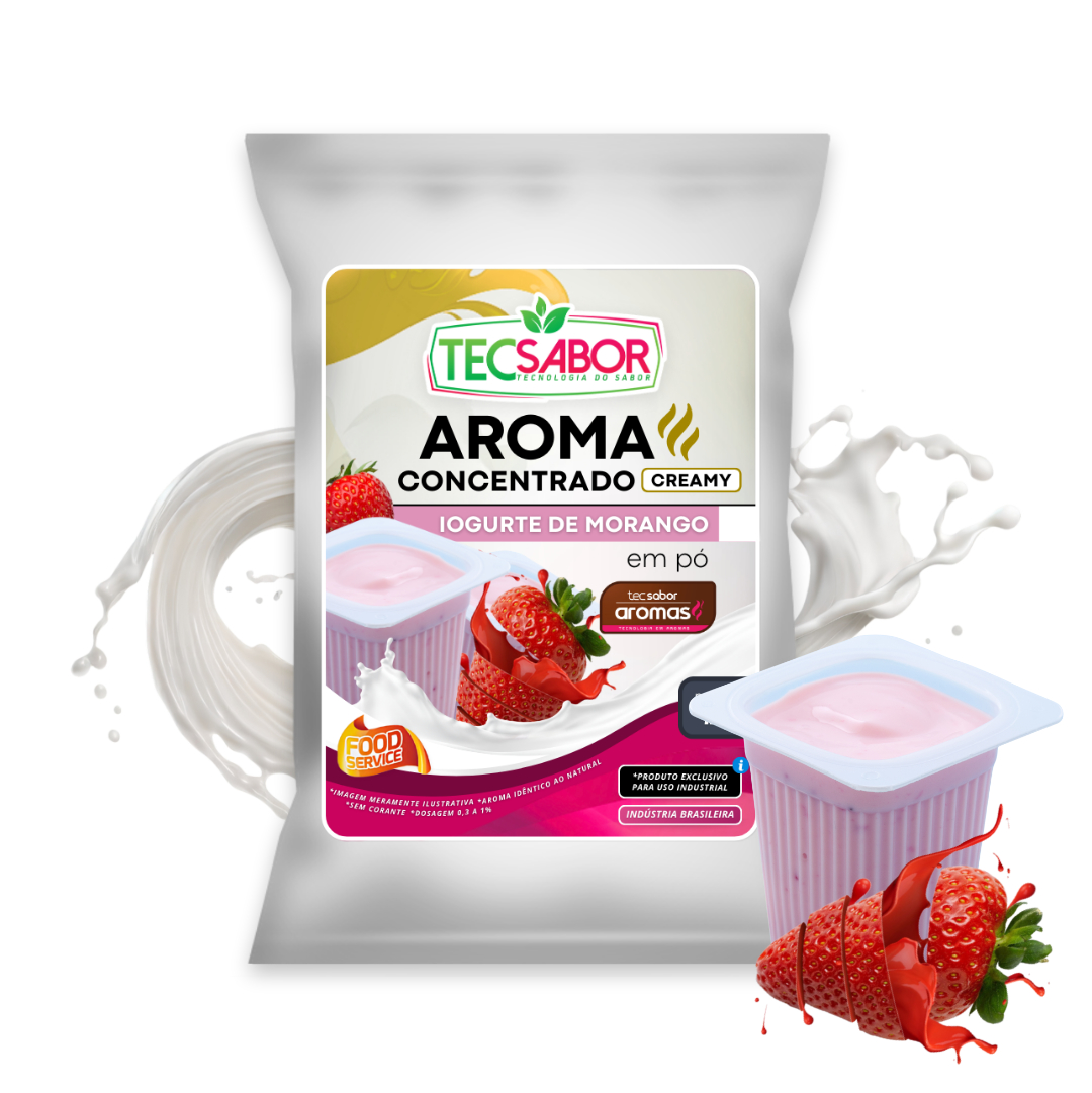 Aroma Idêntico ao Natural de Iogurte de Morango (AIN): desenvolvido em pó com perfil creamy e frutado equilibrado, integrando a acidez característica do iogurte às notas doces e levemente ácidas do morango, garantindo cremosidade sensorial, boa dispersão, estabilidade térmica e desempenho consistente em aplicações industriais.