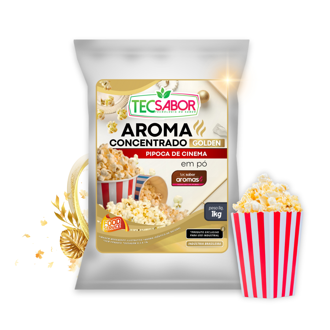 Aroma Idêntico ao Natural de Pipoca de Cinema (AIN) da linha Golden com perfil amanteigado, quente e envolvente, remetendo à pipoca recém-preparada, com excelente estabilidade, fixação aromática e desempenho consistente em aplicações industriais.